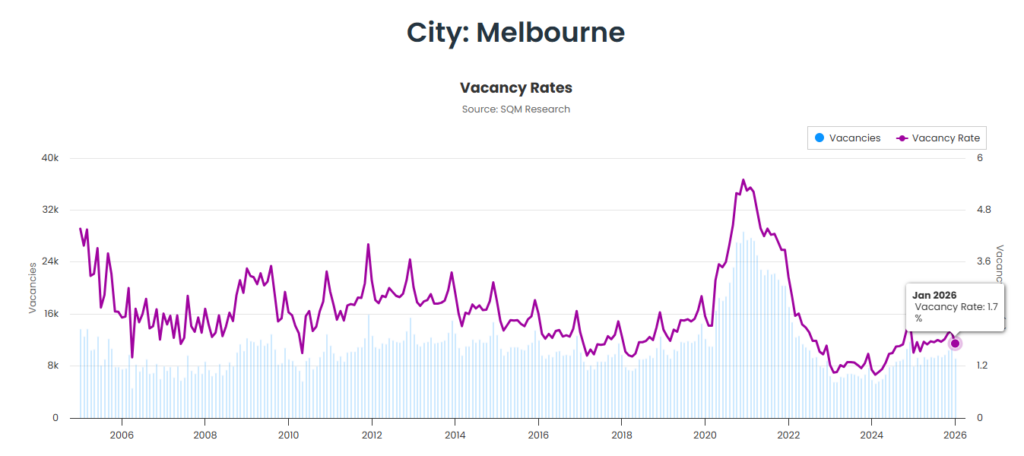 SQMリサーチによると、1月のメルボルン都市部の賃貸空室率は1.7%。100件の賃貸物件のうち空いているのは1.7件だけという状況です。