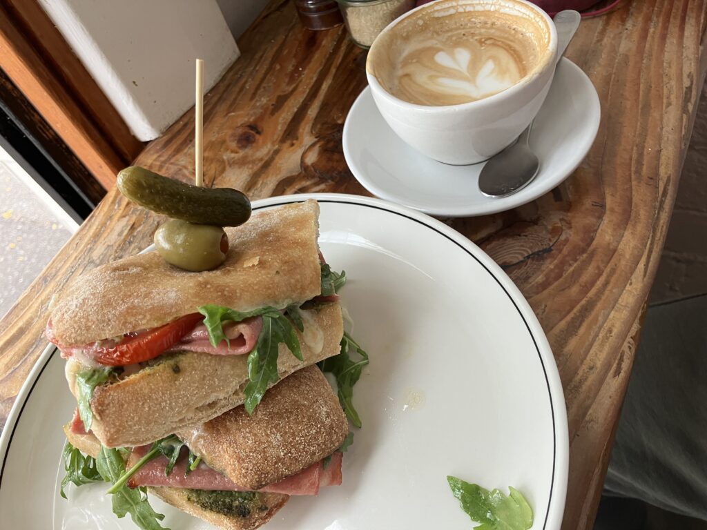カフェの定番メニューに加え、お店のお勧め品なども黒板に書き出されています。以前は、メキシカンチックなメニューが数点あったのですが、先日は数種類のサンドイッチバラエティに代わっていました。と言うことで、今回私が注文したのがこちらのモータデーラ・トスティ(Mortadella Toastie)。