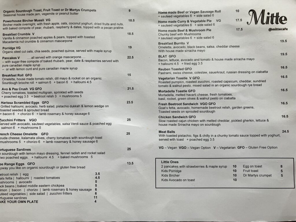 こちらのミッテも、メルボルンのカフェの多くがそうであるように、ベジタリアンやビーガン、そしてグルテンフリーのメニューを多く提供しています。