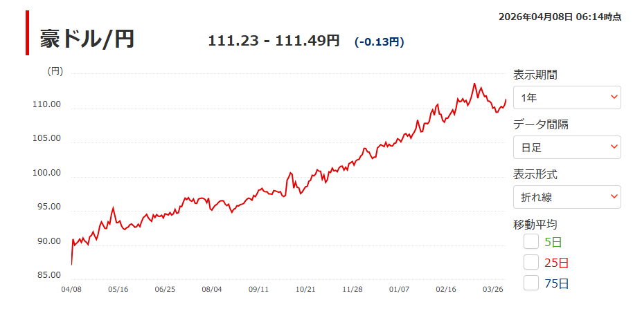 2020年には1豪ドルは74円でしたが、2026年4月8日現在1豪ドルは111円と、豪ドルの価値が50%上昇しています。現在の不動産価格の上昇に加えて、為替も追い風となり、大きな利益を享受する事が可能です。