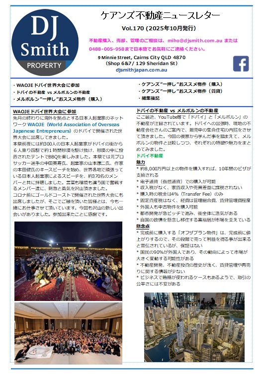DJスミスプロパティではケアンズ不動産ニュースレター10月号を発行しました。